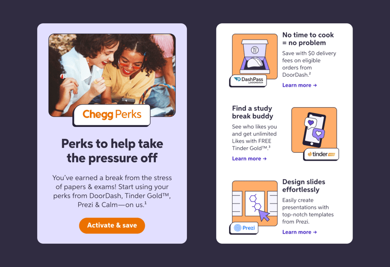 Chegg Perks was a partnership between Chegg and a number of popular brands that are recognized and appreciated among students. It provided exclusive benefits as part of Chegg's subscriptions, ensuring students received even more value for their money. Our goal for this campaign was to promote the partner brands' offers while keeping Chegg as the center focus and connecting thread.