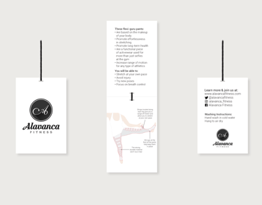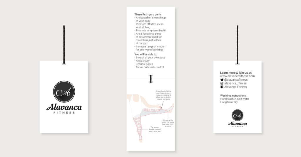 Alavanca Fitness is a brand that believes all active wear should serve a functional purpose. Their patented Flexi-Guru Pants are meant to assist with stretching challenges for athletes, yogis, dancers, and more. I had the opportunity to work with them to design a product tag and illustrations that help demonstrate the use of the pants.