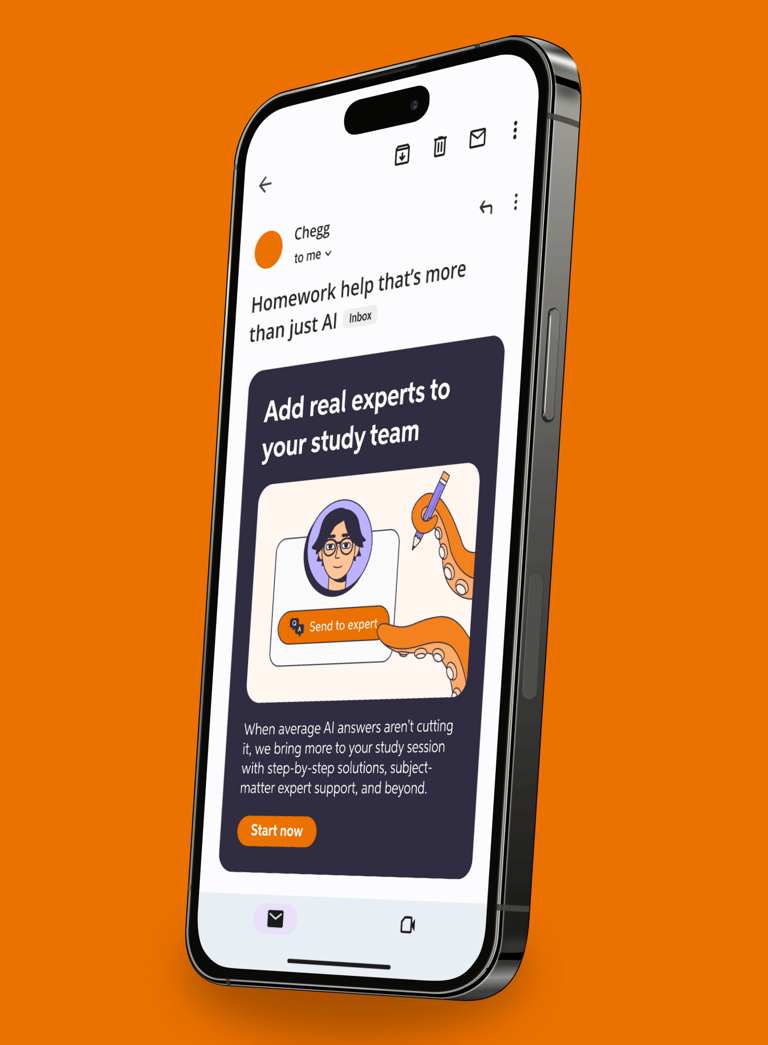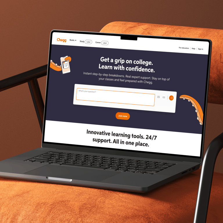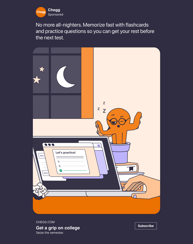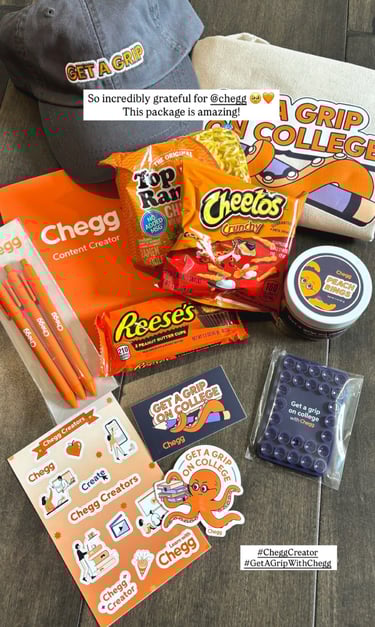Meet Ace, Chegg's new mascot who is helping students "get a grip" on college! She's got 8 arms and 9 brains, so she's ready for anything. In order to introduce Ace to the world, we launched our Get a Grip campaign in H1 2025. This was truly an omnichannel campaign, with streaming ads, paid & organic social, email, display ads, and even incorporation within the Chegg product.