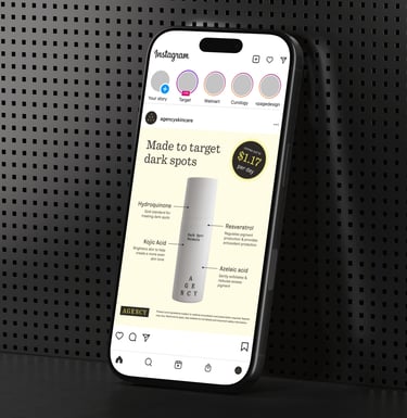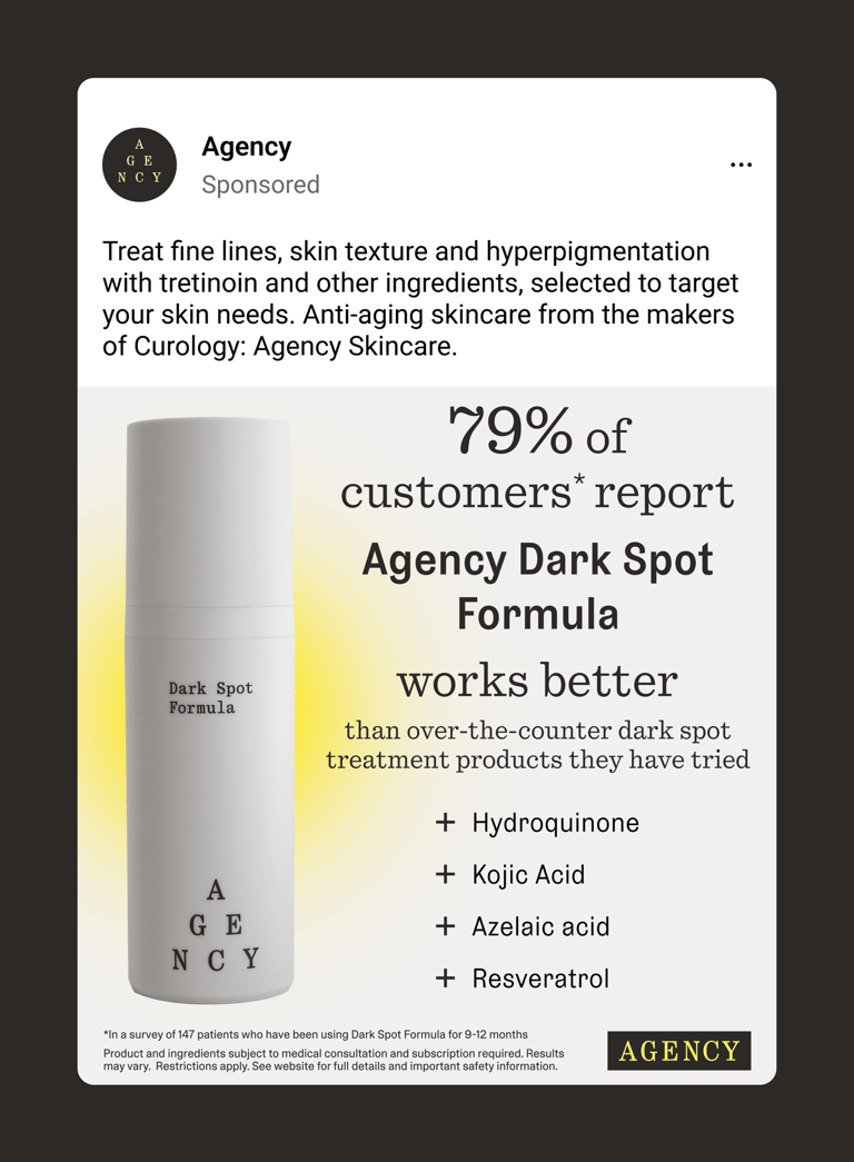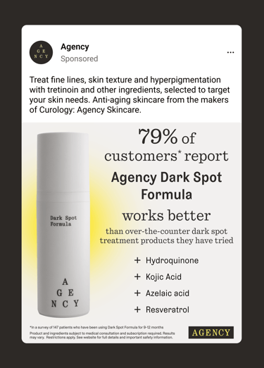 Curology and Agency are sister skincare brands, each serving distinct audiences and needs. Curology targets a younger audience dealing with acne and breakouts, while Agency focuses on an older audience addressing fine lines, dark spots, and other visible signs of aging. I designed digital assets for both brands’ social media and display ad campaigns, ensuring each was tailored to its audience and aligned with established brand guidelines.